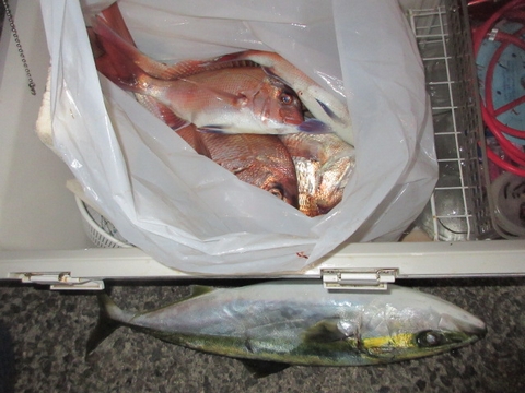 魚種 サイズ 数 真鯛 45〜40p 3尾 メジロ 2尾 グレ 47・30p 2尾 大アジ チャリコ・ガシラ・ウマ